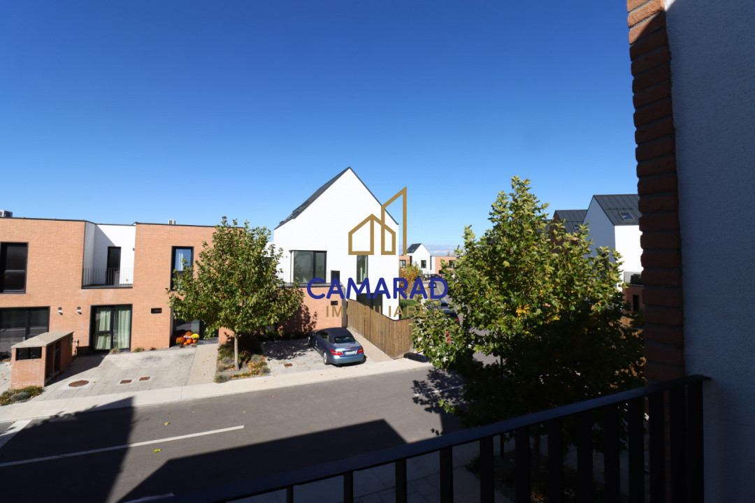 Imobilul este bine compartimentat, parterul având un living generos cu acces către terasa și curtea proprie. Tot pe parter avem bucataria cu crama, o baie si hol de acces. La etaj sunt 2 dormitoare fiecare cu cate un balcon si baie. Dormitorul matrimonial a fost prevazut cu baie proprie insa proprietarul actual a preferat sa faca un dressing.
