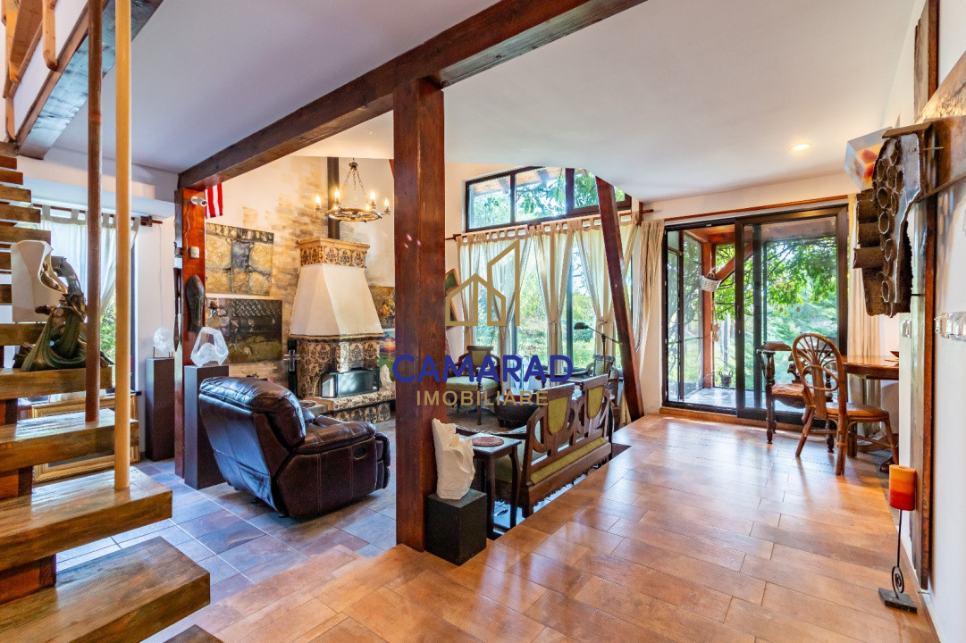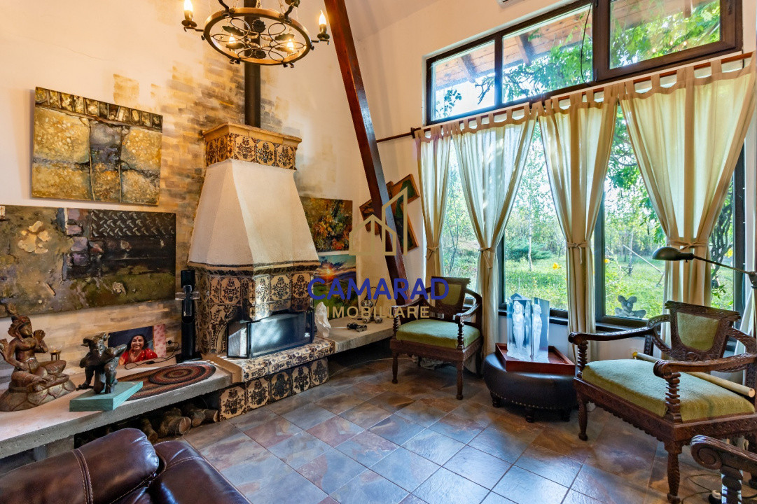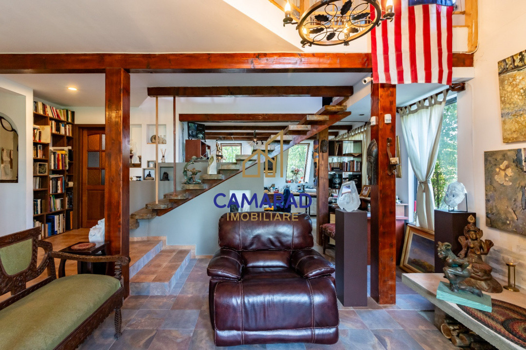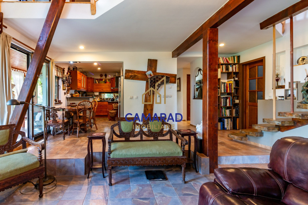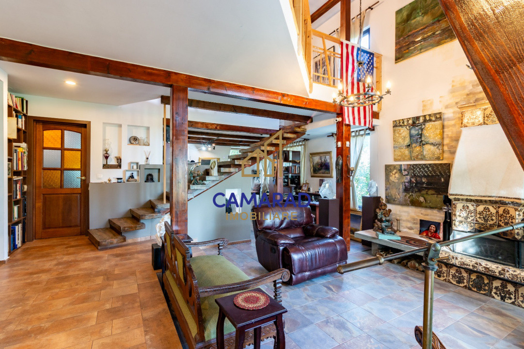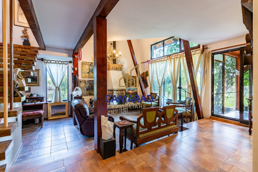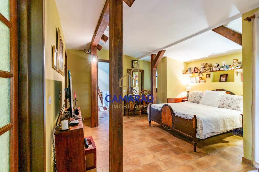 Imobilul este alcătuit din: zonă de living și relaxare, bucătărie, 3 dormitoare, 3 băi, 2 dressing-uri în dormitorul matrimonial, garaj prevăzut cu telecomandă, atelier de tâmplărie, atelier de pictură și terasă acoperită închisă. Livingul este inundat de lumină naturală datorită ferestrelor mari, iar pe pereți găsim diverse tablouri, fiecare piesă fiind atent aleasă pentru a crea o atmosferă inspirantă. În centrul livingului, șemineul atrage imediat privirile, fiind punctul forte al întregii încăperi. Dormitorul matrimonial este decorat în tonuri calde și relaxante și este un refugiu perfect pentru odihnă. Mobila, atent aleasă, combină stiluri vintage cu elemente moderne, creând un spațiu confortabil și primitor. Balconul atașat dormitorului este un refugiu pentru cei ce vor să se relaxeze. Dormitorul este prevăzut cu baie proprie și 2 dressinguri. Bucătăria este complet mobilată și utilată, având mașină de spălat vase, hotă, frigider și este dotată cu o cămară cu ventilație. Podul este locuibil, are instalatiile transe si se poate amenaja dupa bunul plac.