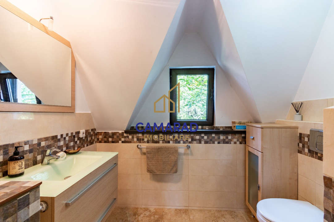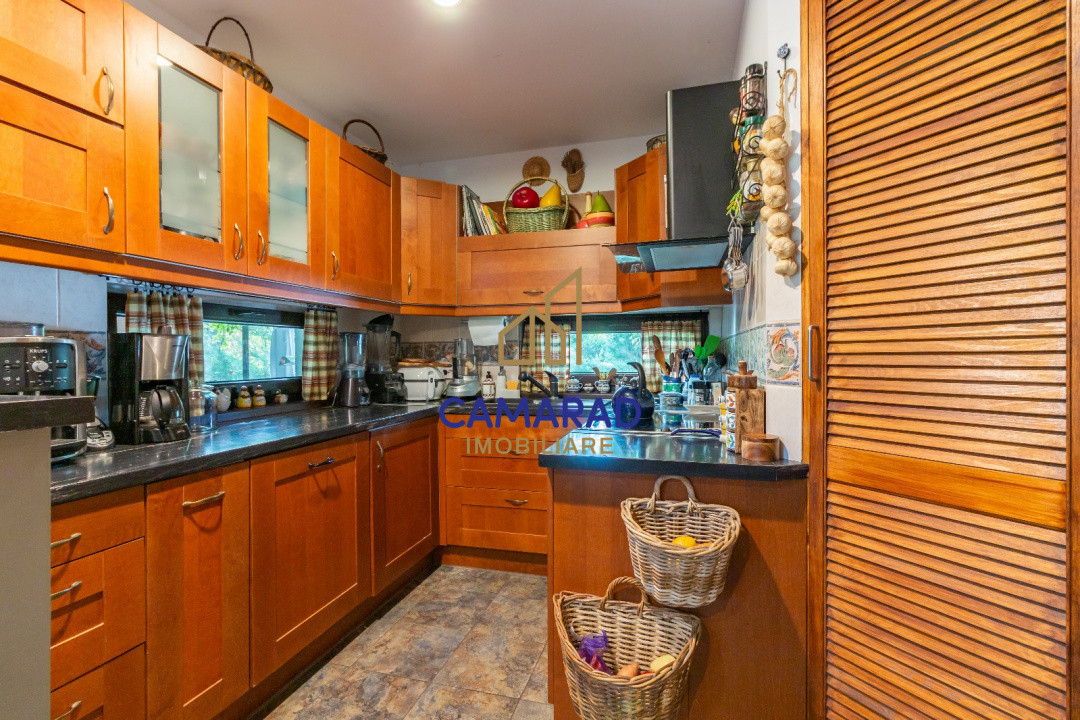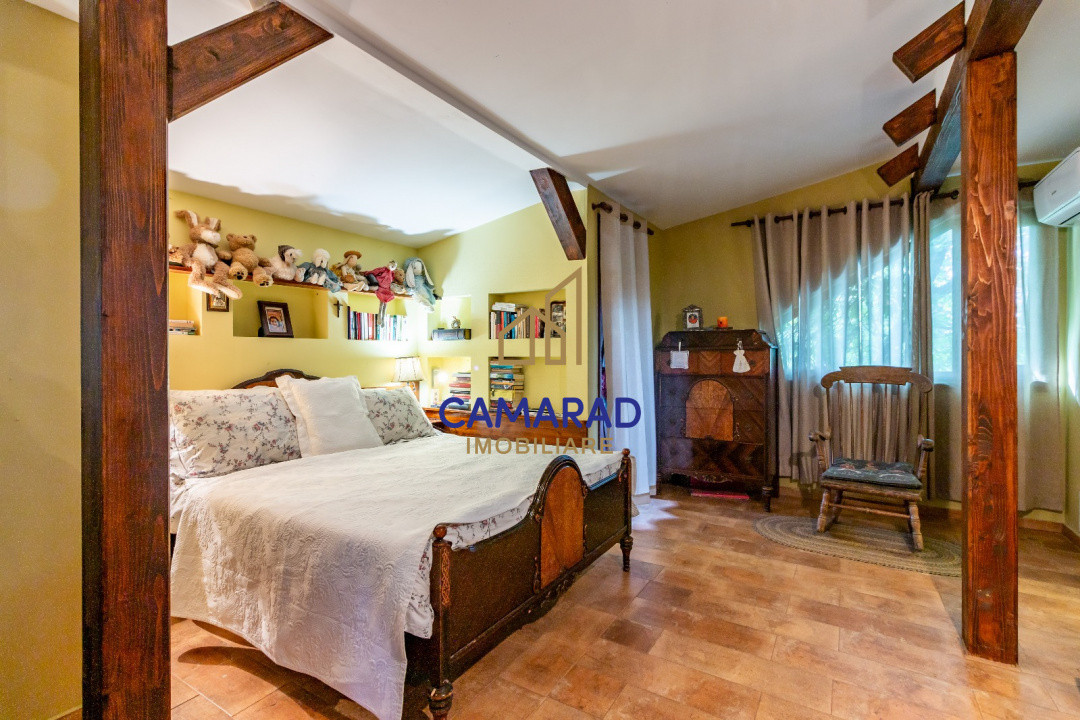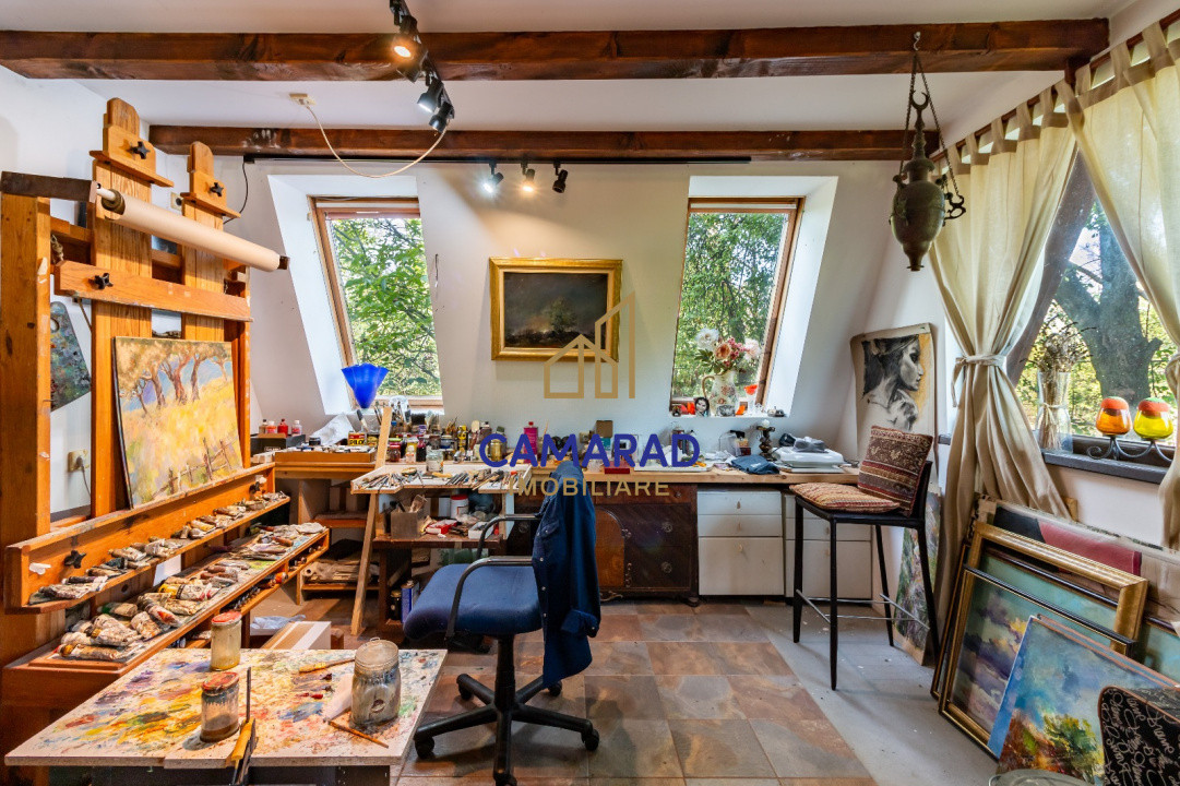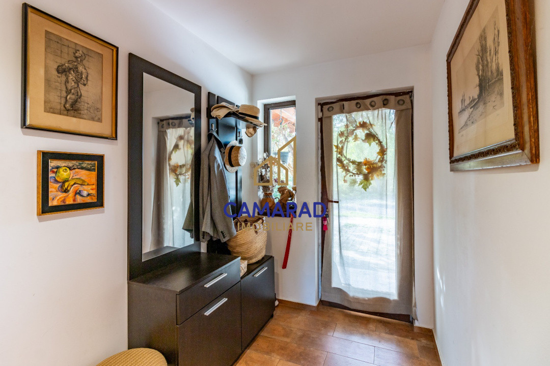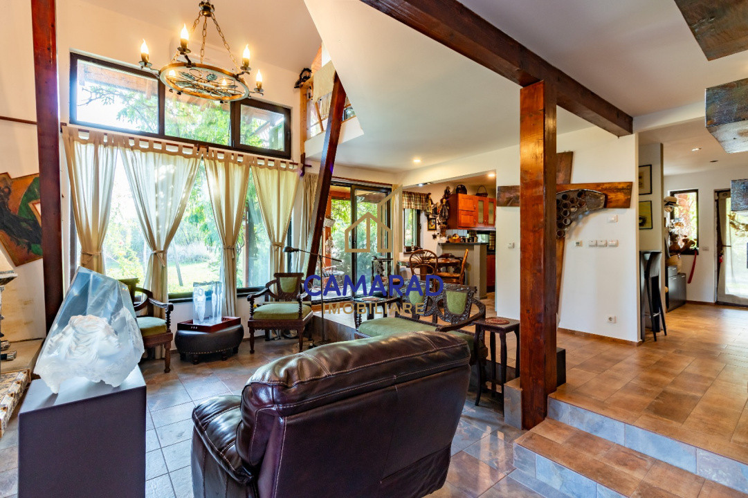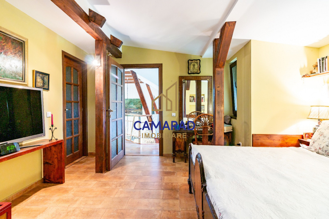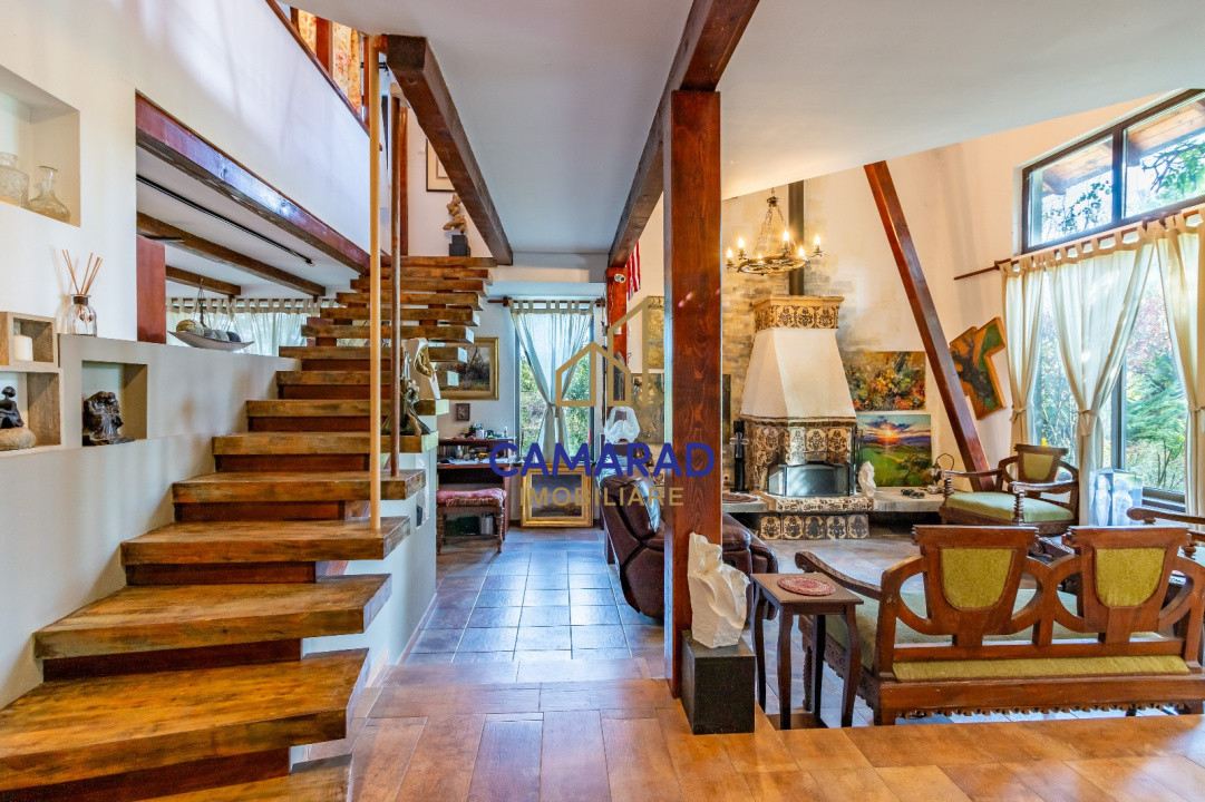 Imobilul este alcătuit din: zonă de living și relaxare, bucătărie, 3 dormitoare, 3 băi, 2 dressing-uri în dormitorul matrimonial, garaj prevăzut cu telecomandă, atelier de tâmplărie, atelier de pictură și terasă acoperită închisă. Livingul este inundat de lumină naturală datorită ferestrelor mari, iar pe pereți găsim diverse tablouri, fiecare piesă fiind atent aleasă pentru a crea o atmosferă inspirantă. În centrul livingului, șemineul atrage imediat privirile, fiind punctul forte al întregii încăperi. Dormitorul matrimonial este decorat în tonuri calde și relaxante și este un refugiu perfect pentru odihnă. Mobila, atent aleasă, combină stiluri vintage cu elemente moderne, creând un spațiu confortabil și primitor. Balconul atașat dormitorului este un refugiu pentru cei ce vor să se relaxeze. Dormitorul este prevăzut cu baie proprie și 2 dressinguri. Bucătăria este complet mobilată și utilată, având mașină de spălat vase, hotă, frigider și este dotată cu o cămară cu ventilație. Podul este locuibil, are instalatiile transe si se poate amenaja dupa bunul plac.