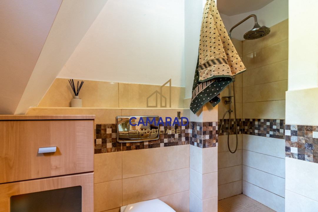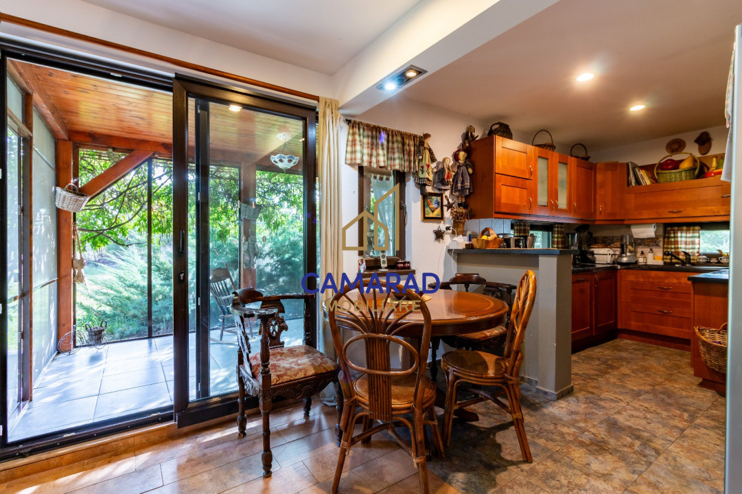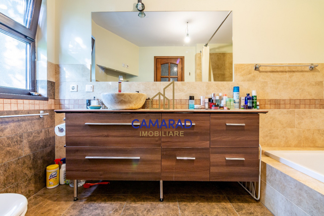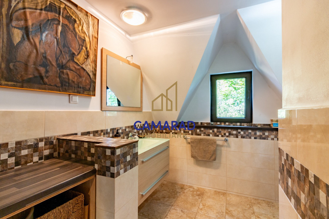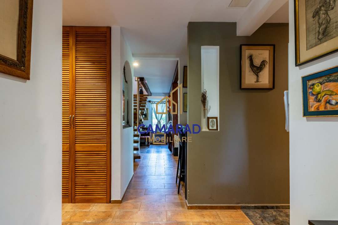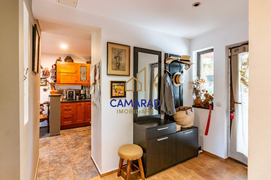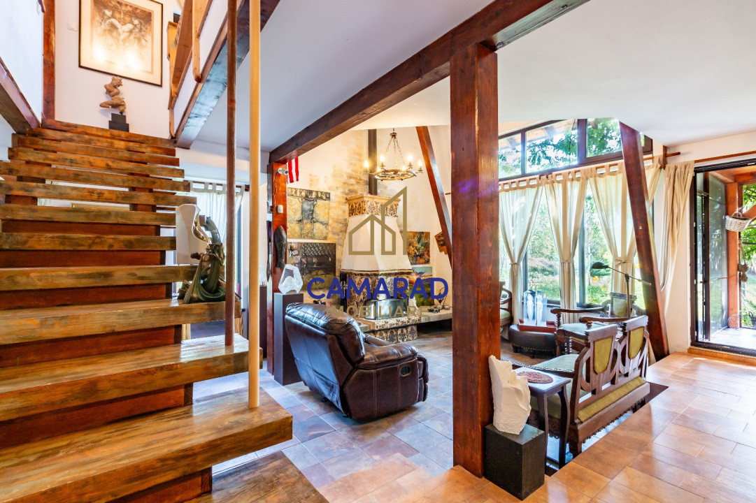 Imobilul este alcătuit din: zonă de living și relaxare, bucătărie, 3 dormitoare, 3 băi, 2 dressing-uri în dormitorul matrimonial, garaj prevăzut cu telecomandă, atelier de tâmplărie, atelier de pictură și terasă acoperită închisă. Livingul este inundat de lumină naturală datorită ferestrelor mari, iar pe pereți găsim diverse tablouri, fiecare piesă fiind atent aleasă pentru a crea o atmosferă inspirantă. În centrul livingului, șemineul atrage imediat privirile, fiind punctul forte al întregii încăperi. Dormitorul matrimonial este decorat în tonuri calde și relaxante și este un refugiu perfect pentru odihnă. Mobila, atent aleasă, combină stiluri vintage cu elemente moderne, creând un spațiu confortabil și primitor. Balconul atașat dormitorului este un refugiu pentru cei ce vor să se relaxeze. Dormitorul este prevăzut cu baie proprie și 2 dressinguri. Bucătăria este complet mobilată și utilată, având mașină de spălat vase, hotă, frigider și este dotată cu o cămară cu ventilație. Podul este locuibil, are instalatiile transe si se poate amenaja dupa bunul plac.